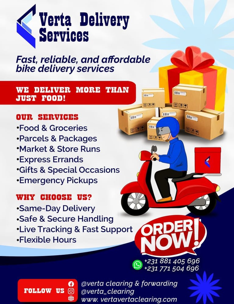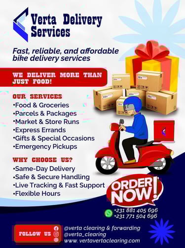 Welcome to Verta Delivery Service, your premier bike delivery partner in Montserrado County. We pride ourselves on providing fast, reliable, and affordable delivery solutions for a wide range of needs. Whether you're ordering food, sending parcels, or running errands, our professional riders ensure your items are handled safely and securely. With our same-day delivery service, live updates, and flexible hours, we make your convenience our top priority.